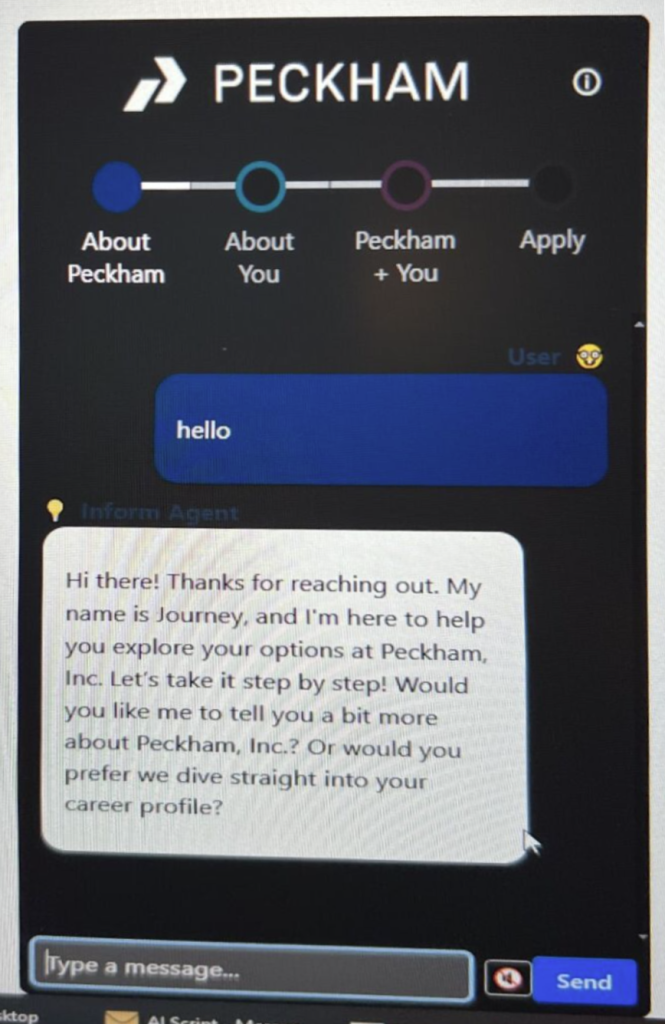 While our project was not selected for the final round, the experience was a remarkable success. The Microsoft team praised the chatbot’s design and functionality and plans to visit Peckham’s headquarters to continue development. This collaboration marks an exciting step forward in using technology to break down barriers to employment and improve access for every job seeker.